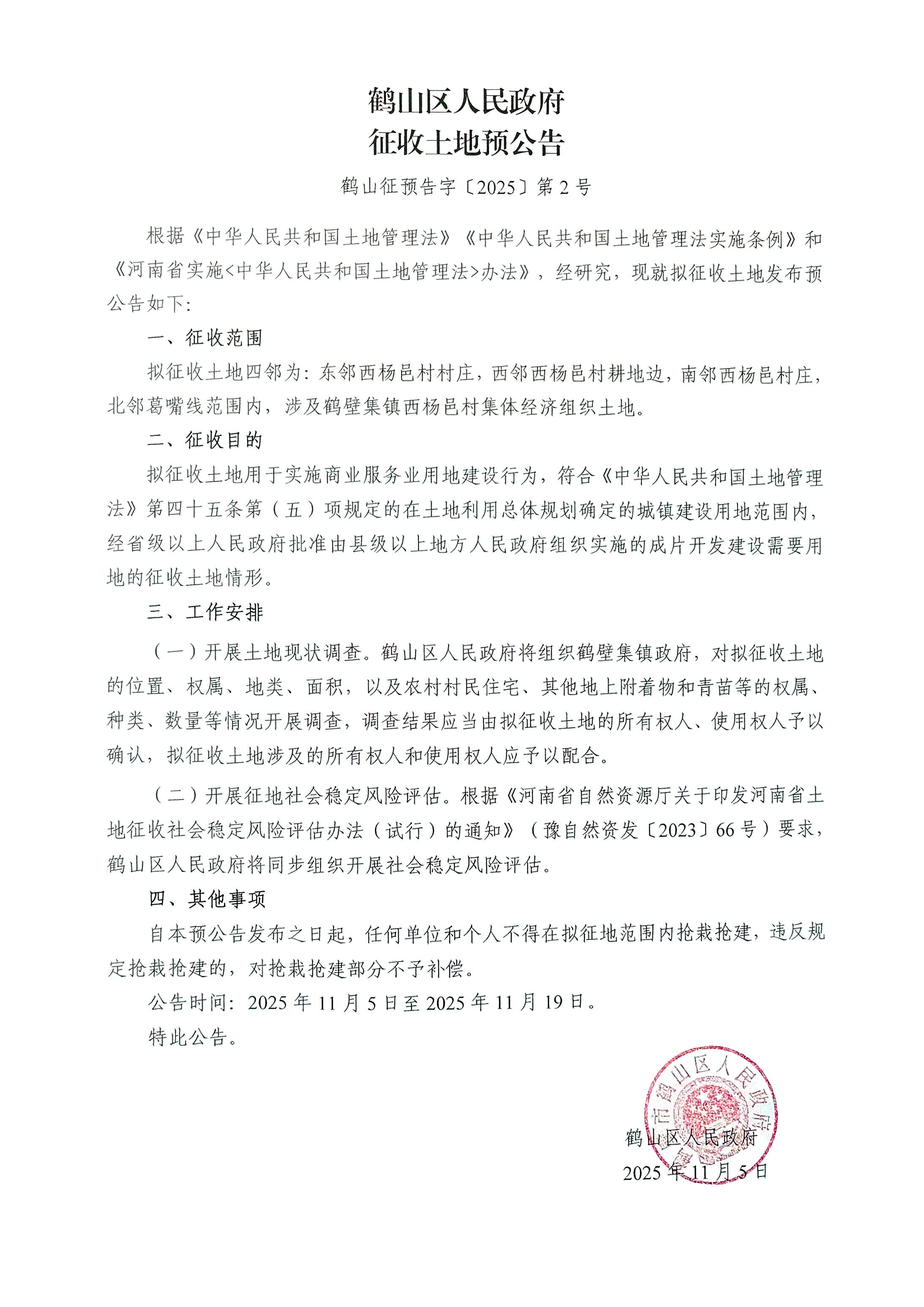鹤山征预告字〔2025〕第2号 鹤山区人民政府征收土地预公告
