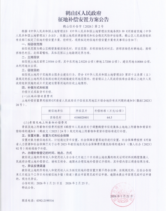 鹤山征补告字〔2026〕第2号 鹤山区人民政府征地补偿安置方案公告