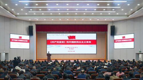 李明霖以《<共产党宣言>与中国新民主主义革命》为题目,采取历史史实再现和互动问答的多媒体教学方式,从八个具有代表性的历史横截面切入,以生动详实的事例,回顾了卡尔·马克思为追求真理、投身人类解放事业而不懈奋斗的光辉一生,阐释了《共产党宣言》的发表背景、核心要义与理论框架,生动展现了马克思主义指导中国新民主主义革命的具体实践。要求全区干部把研读习近平新时代中国特色社会主义思想和马克思主义经典著作作为必修课,持续从中汲取理论营养与精神力量,不断提升政治素养与履职能力,以实际行动践行共产党人的初心使命。