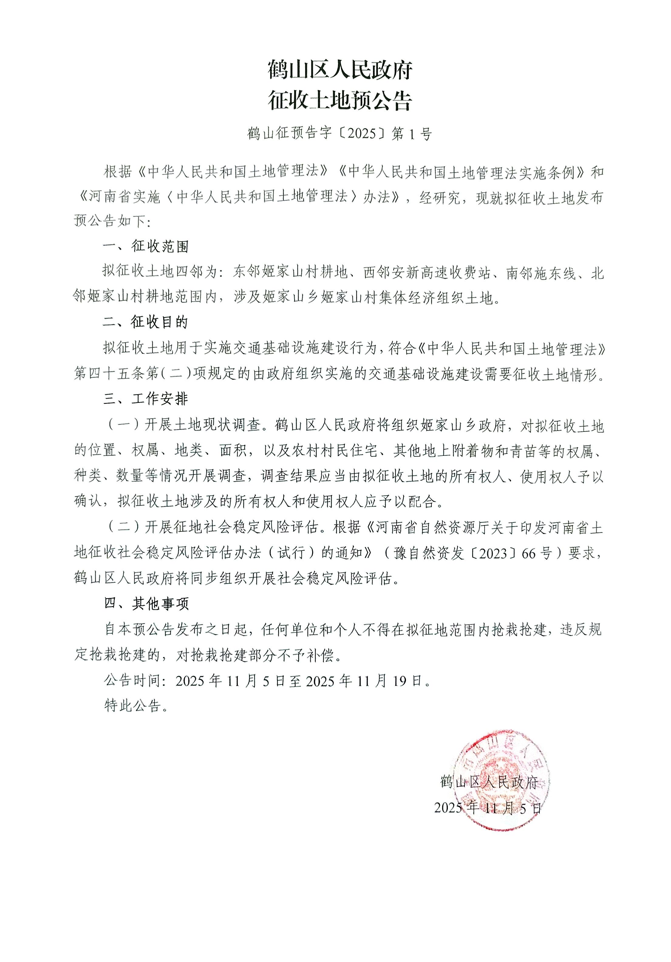 鹤山征预告字〔2025〕第1号 鹤山区人民政府征收土地预公告