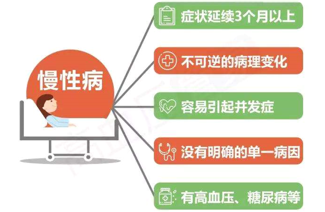 慢性病全称慢性非传染性疾病,主要指以心脑血管疾病、糖尿病、恶性肿瘤、慢性阻塞性肺部疾病、精神异常和精神病等为代表的一组疾病。具有病程长、病因复杂、病理生理变化不可逆等特点。